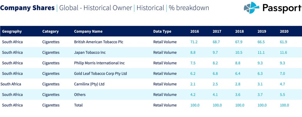 Table 2. South Africa Cigarette Percentage Retail Volume Share – 2016 to 2020