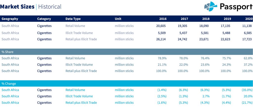 Table 1. South Africa Cigarette Retail and Illicit Trade Volume – 2016 to 2020