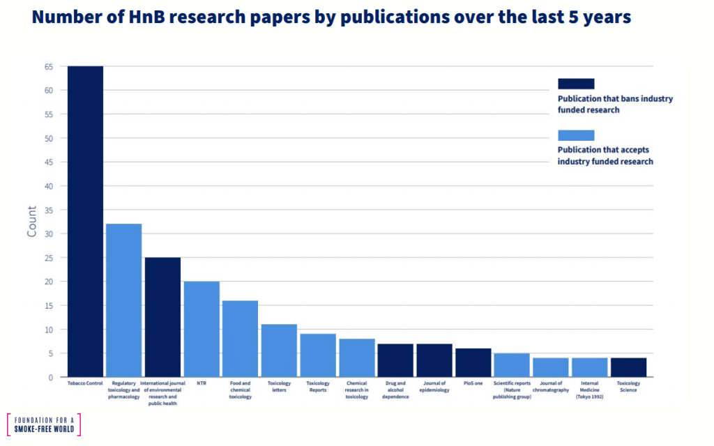 Indeed, there now exists two distinct silos in tobacco research: one in which the evidence for harm reduction is robust and growing; and one in which such evidence does not exist. Foundation analyses of publication trends underscore these parallel universes. Papers in Tobacco Control, a BMJ journal, come exclusively from academics. Due to bans, none come from industry. By contrast, 95% of papers in Regulatory Toxicology and pharmacology are from industry. This leads to serious publication bias.